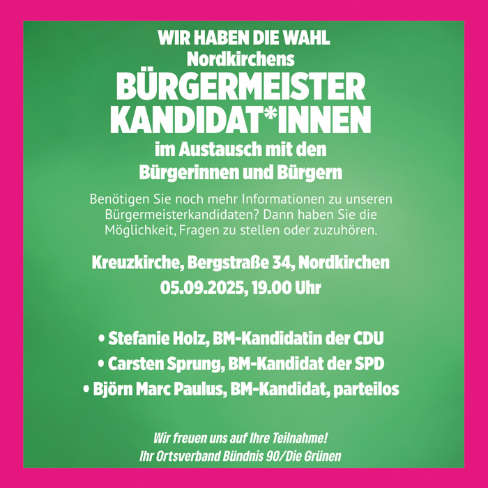 Damit sich nun möglichst viele Bürgerinnen und Bürger vor Ort ein Bild von den Bürgermeisterkandidatinnen machen können lädt der GRÜNE Ortsverband am 05.09 um 19:00 zur Podiumsdiskussion in die evangelische Kreuzkirche in Nordkirchen ein.